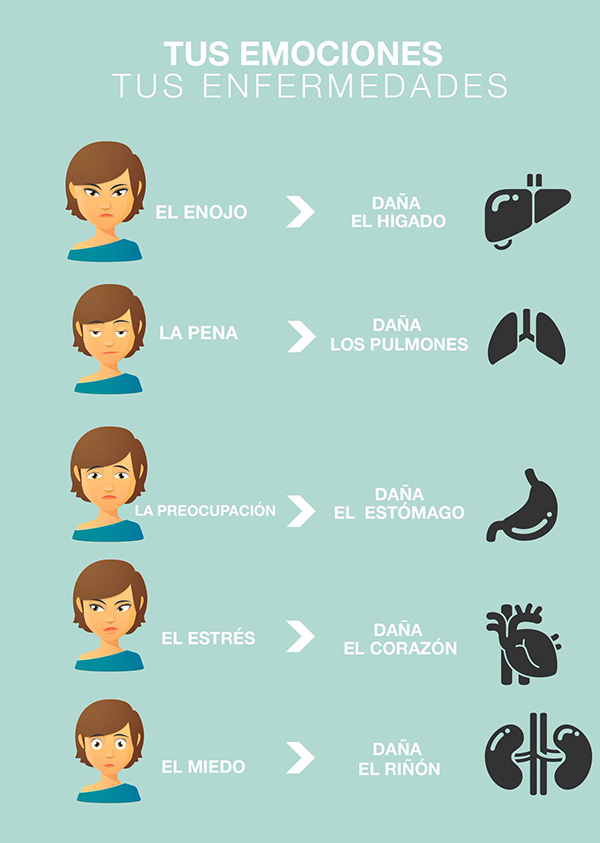 Según la Medicina Tradicional China hay emociones que pueden afectar ciertos órganos o funciones. Por ejemplo, la tristeza disminuye el sistema inmunológico y da predisposición a enfermedades respiratorias y digestivas. La ira y la frustración afectan el hígado y la vesícula biliar y además generan tensión muscular.